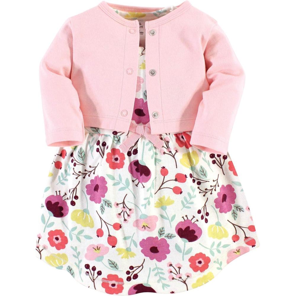 Touched by Nature Infant Toddler Girls Organic Cotton Dress and Cardigan, Rainbows Sunshine(Blush Blossom)